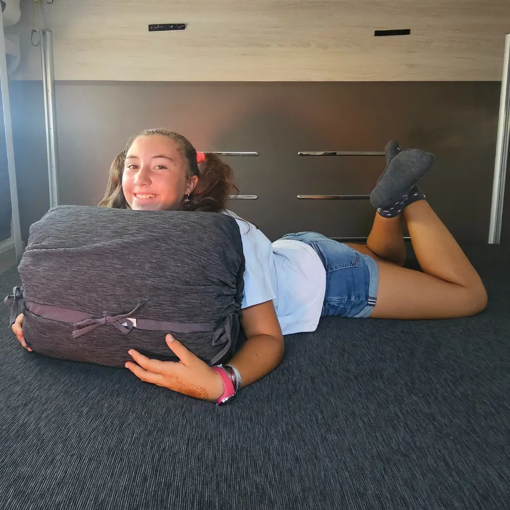 Di giorno è un morbido cuscino d’arredo — elegante e pratico (a scelta: a “salsiccia” o nella tradizionale forma quadrata). Di notte si trasforma in un set da letto pronto all’uso, con lenzuola in puro cotone e dettagli intelligenti pensati per il tuo benessere. Sciogli la patella che contiene il cuscino, srotoli, zippi… e il gioco è fatto: sei a casa, ovunque tu sia.